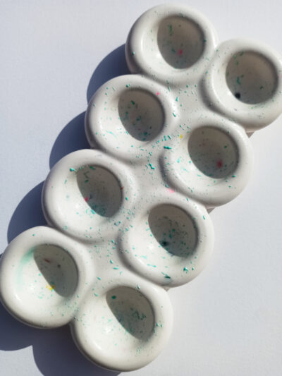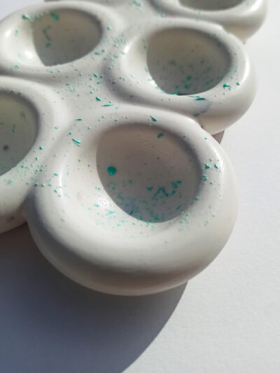 Oscar est recouvert de deux couches successives de vernis spécifique Jesmonite. Ne pas mettre au lave-vaisselle, un simple coup d’éponge humide suffit à le nettoyer.